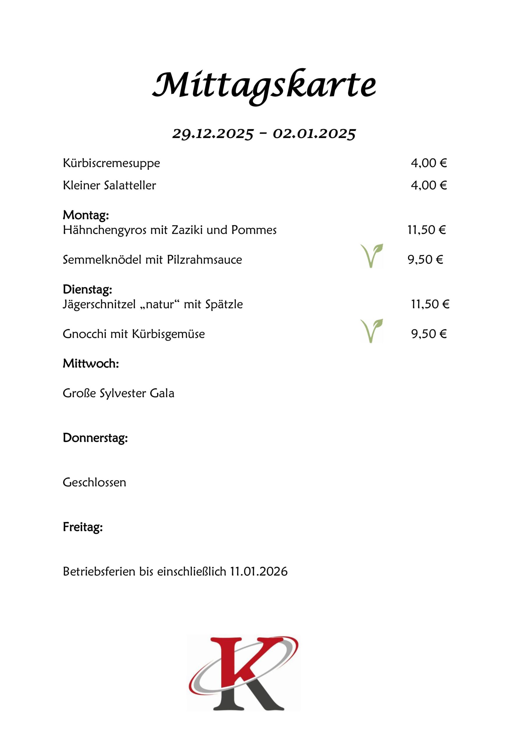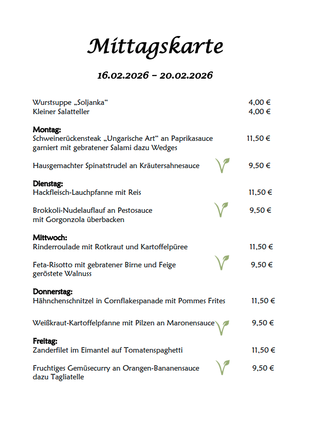 Unsere Restaurant-Öffnungszeiten sind wochentags von 11.30 bis 14.00 Uhr sowie ab 17.00 Uhr. An Sonntagen hat unsere Küche von 11.00 bis 14.00 Uhr geöffnet.